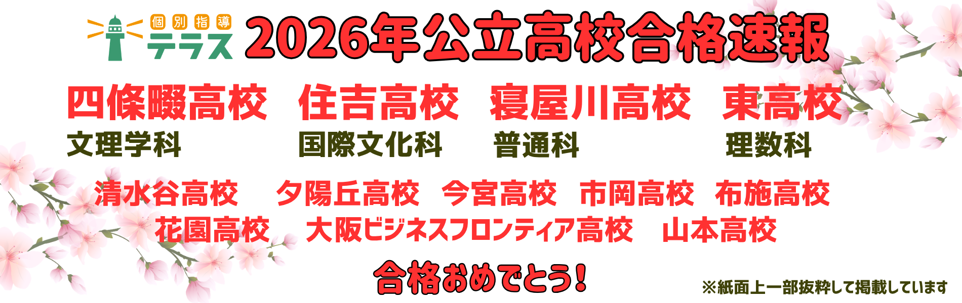 こんにちは!個別指導テラスです😊 先週大阪府の公立高校一般入試の合否発表がありました! 四條畷高校(文理学科)2名 住吉高校(国際文化科)1名 寝屋川高校(普通科)1名 東高校(理数科)1名 清水谷高校1名 夕陽丘高校2 […]