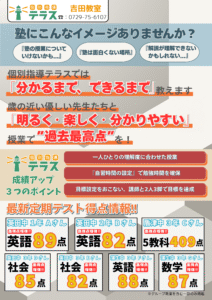 2025年10月8日 / 最終更新日時 : 2025年10月8日 テラス塾長 2学期門配チラシ-吉田 (1) _______________ 最後までお読みいただき、ありがとうございました! 個別指導テラスは、成績アップと面倒見の良さ、居心地の良さで地域No1を目指します! 塾に興味をもっていただいた方は、下記よりお気軽にお問い合わせください! まずはお気軽にお問い合わせください Webお問い合わせ Webでのお問い合わせは24時間受付中! コメントを残す コメントをキャンセルメールアドレスが公開されることはありません。 ※ が付いている欄は必須項目ですコメント ※ 名前 ※ メール ※ サイト 次回のコメントで使用するためブラウザーに自分の名前、メールアドレス、サイトを保存する。