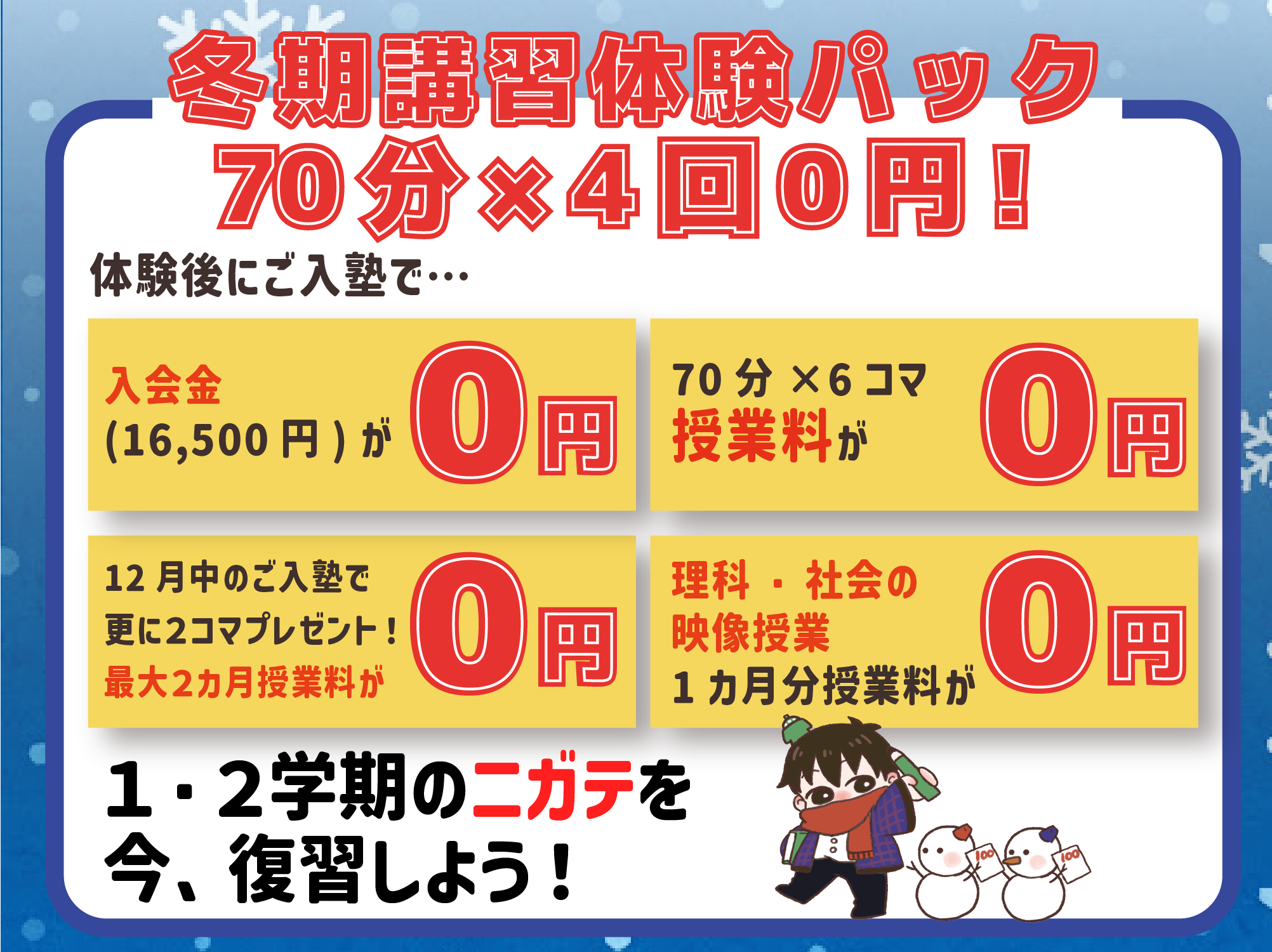 そんなことにならないように、不安をなくして年越しができるように、今年も個別指導テラス吉田教室・蒲生教室のどちらでも12/15(月)から冬期講習を開始します!