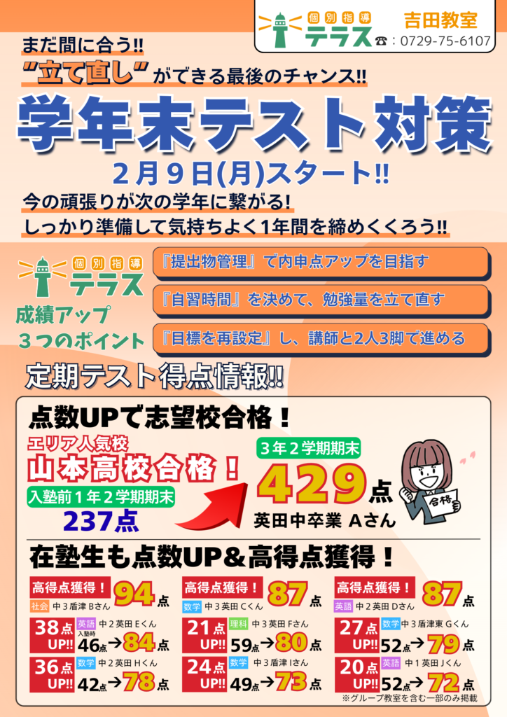 【個別指導テラス】学年末テスト対策受付中!【吉田教室・蒲生教室】